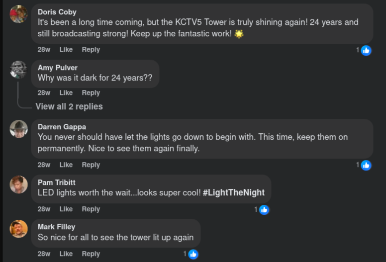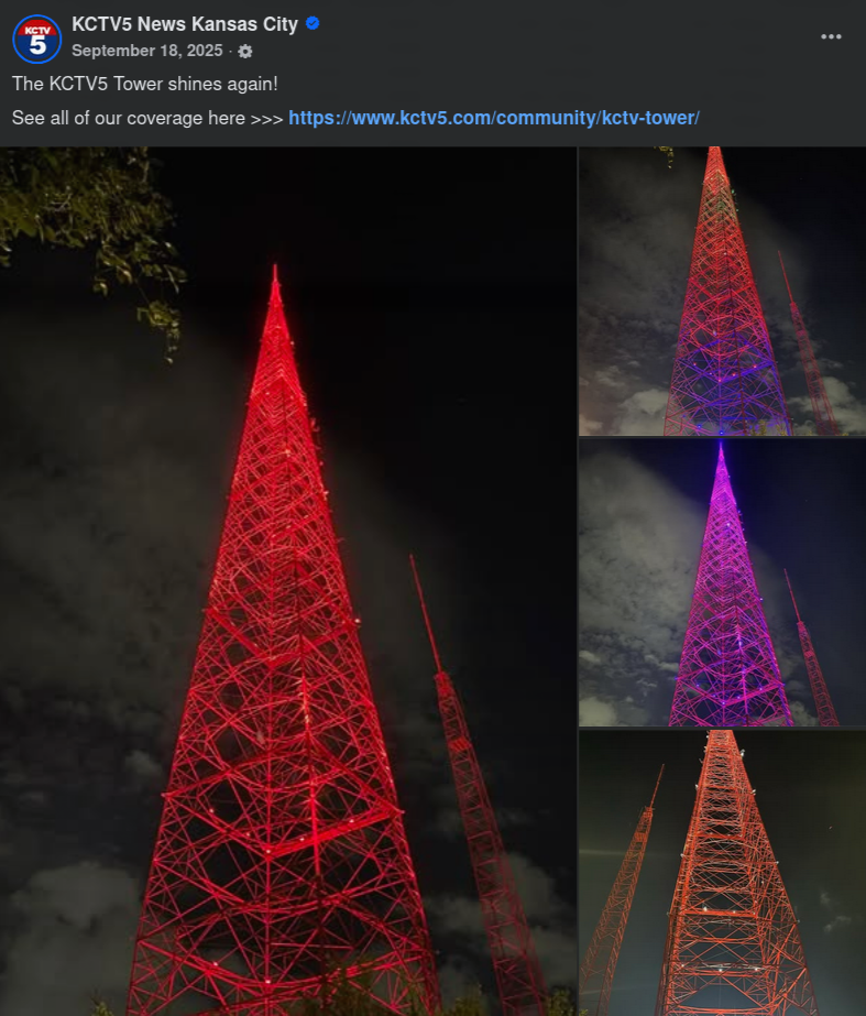 “History Rekindled: Iconic KCTV5 Tower Shines Again Over Kansas City Skyline.” KCTV5, September 19, 2025. https://www.kctv5.com/2025/09/19/watch-history-rekindled-iconic-kctv5-tower-shines-again-over-kansas-city-skyline/