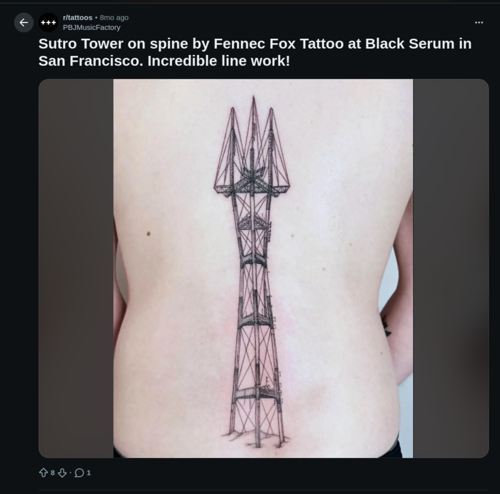 Somewhere in San Francisco right now, someone is sitting in a tattoo chair getting Sutro Tower inked on their arm.